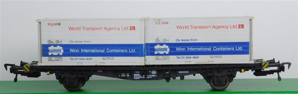 A Fleischmann German container wagon with Winn International containers, warped wagon body, NEM pocket couplings with close coupling mechanisms, , no original box
