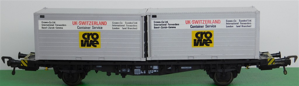 European H0 wagons: Fleischmann German container wagon with Crowe containers, NEM pocket couplings, warped wagon body