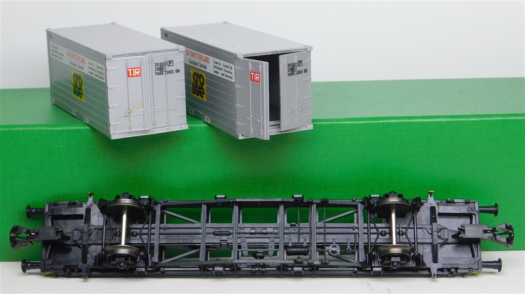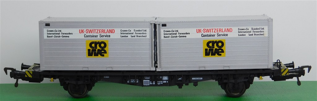 A Fleischmann German container wagon with Crowe containers, warped wagon body, NEM pocket couplings with close coupling mechanisms, , no original box