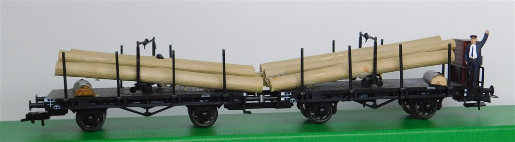 European H0 wagons: Pair Fleischmann single bolster wagons with log load, added wooden supports, missing two stakes