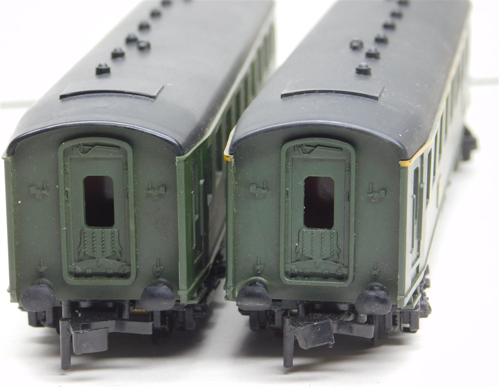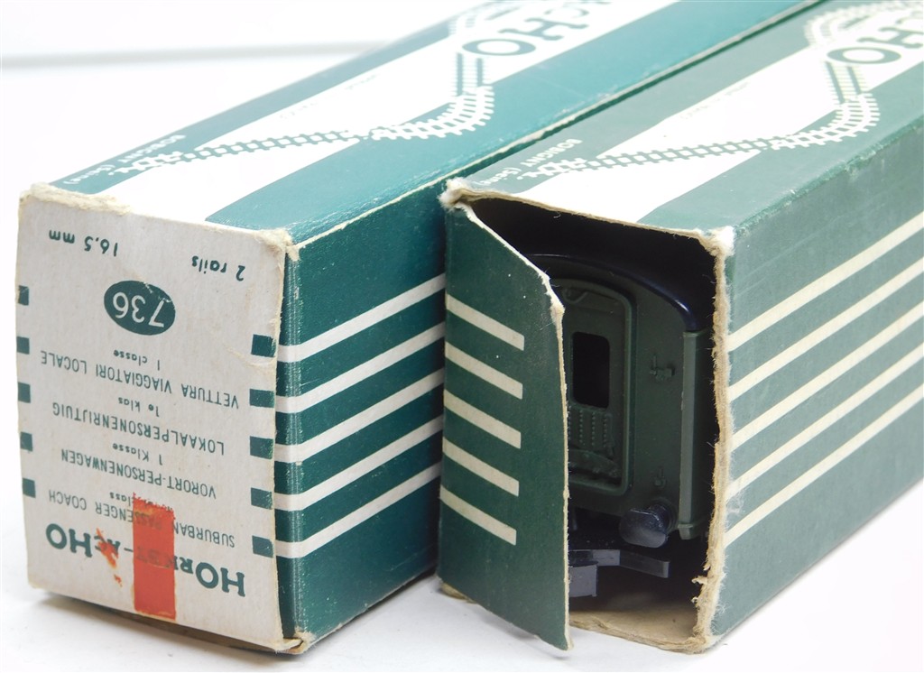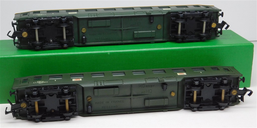 2 Hornby Acho French SNCF 1st class Paris-Lille coaches type A10myfi number 20045, with Hornby Dublo type couplings, in good condition, supplied in the tatty original boxes missing end flaps, one has a yellow stripe along the cantrail line, one does not