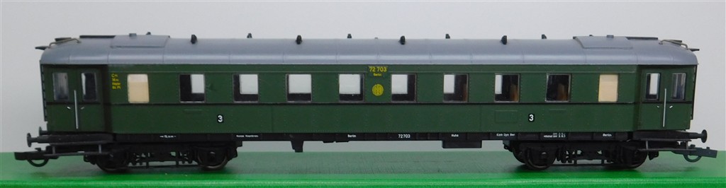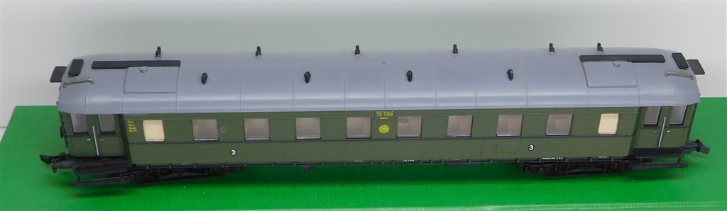 European H0 Coaches: Liliput 286 02 German DRG 3rd class steel bodied coach number 72703, missing corridor connections