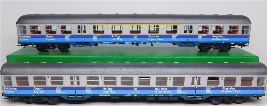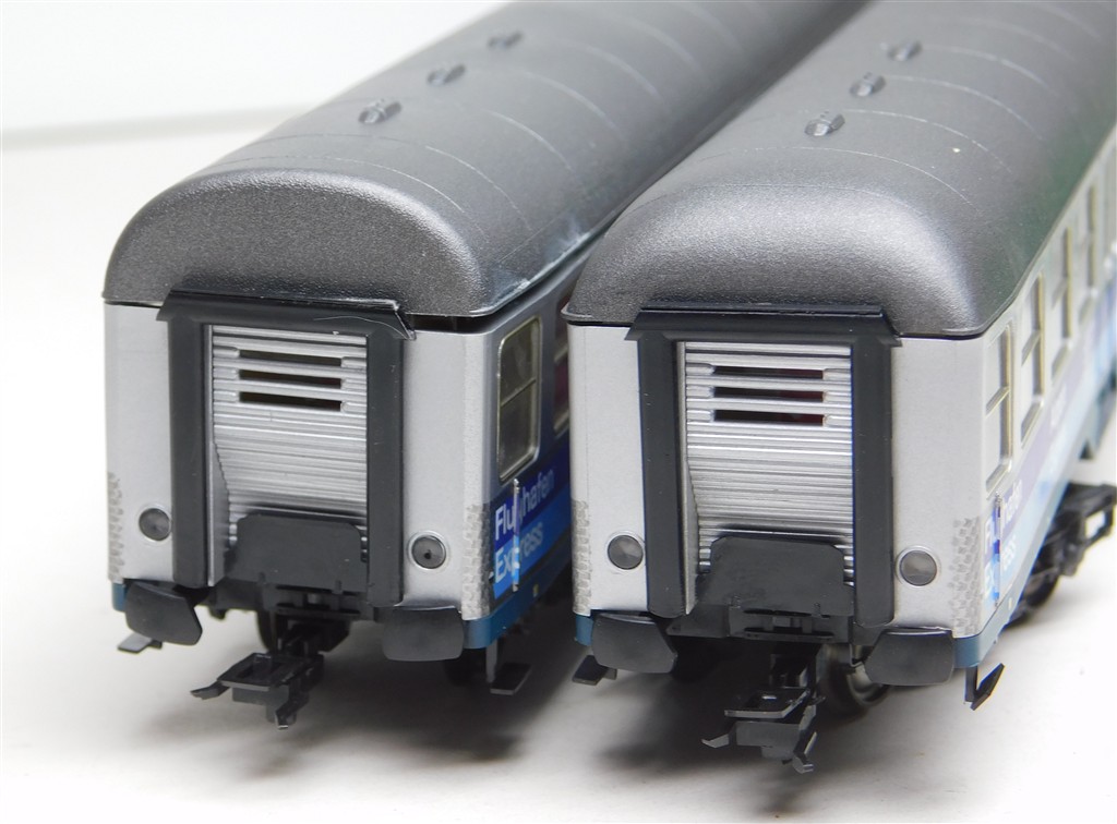 European H0 Coaches: Pair Ade scale length German DB Silverfish coaches with Flughafen Frankfurt am Main advertising
