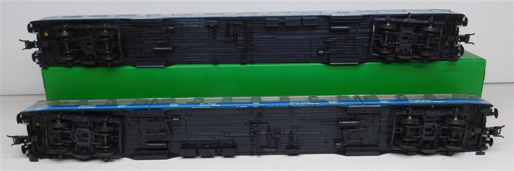 A pair of Ade scale length well detailed high quality German DB Silverfish coaches with Flughafen Frankfurt am Main advertising, in good clean condition, supplied in an incorrect original box. These coaches were made in the early 1970s and feature Willy Ade's own design close coupling mechanisms and coupling pockets which inspired the later NEM 362 standard but which are different, so couplings will need to be adapted to work with other stock.