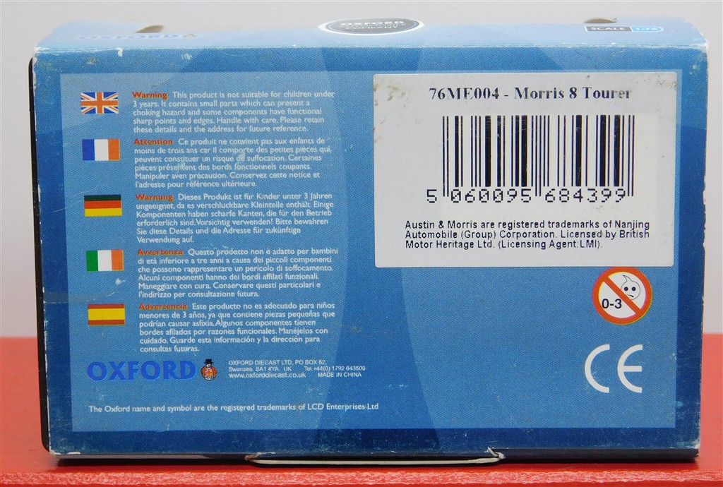 An Oxford Morris Eight Tourer in black livey, missing windscreen otherwise in good condition and supplied in the original box with sleeve.