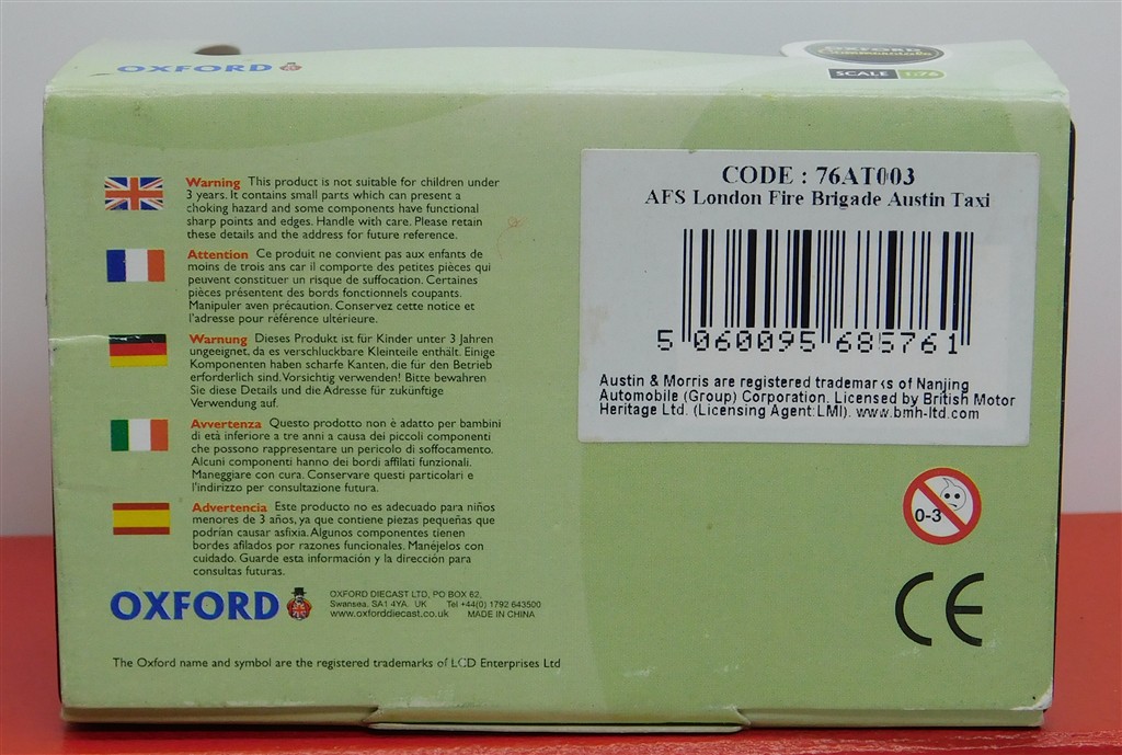 An Oxford 76AT003 AFS London Fire Brigade Austin Taxi, in very good condition and supplied in the original box with sleeve.