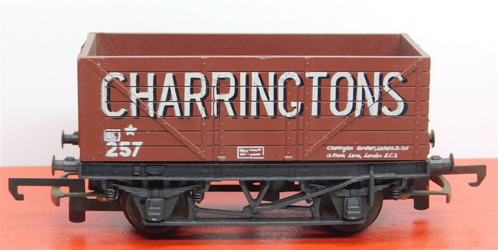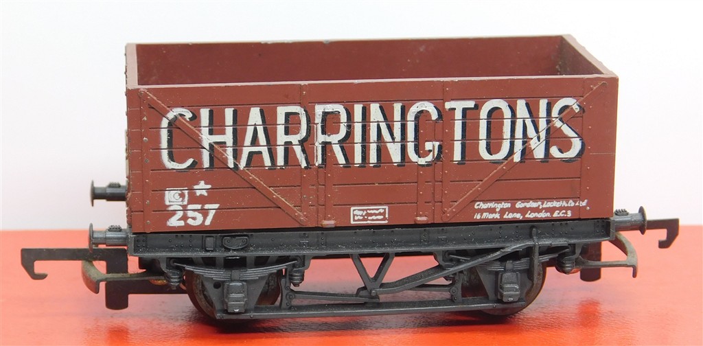 A Trix plastic bodied Charringtons 7 plank wagon with Tri-ang couplings, in fair condition, some heat distortion inside, please note this are 3.8mm/ft scale not 4mm/ft scale, no original box.