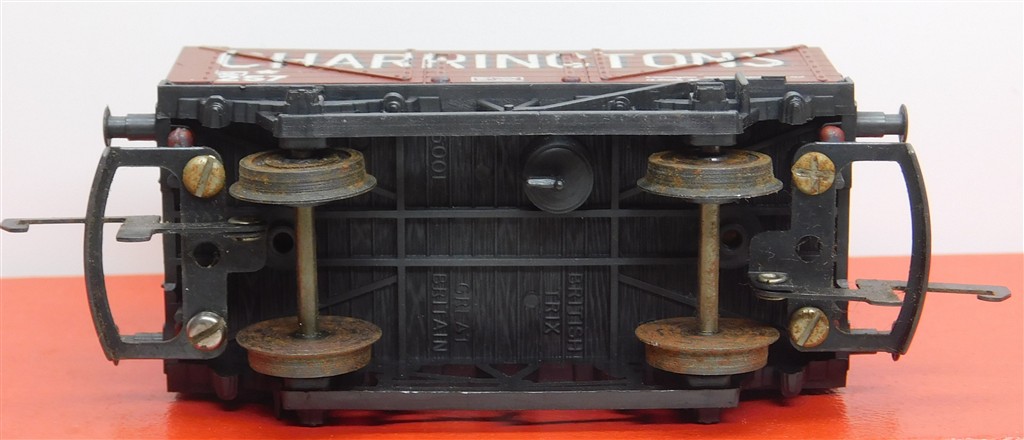 Trix/Liliput 3.8mm: Trix plastic bodied Charringtons 7 plank wagon with Tri-ang couplings