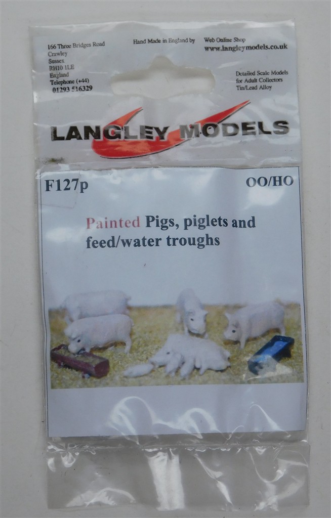 An unopened, white metal Langley Minature Models F127p PAINTED Pigs, piglets and feed troughs