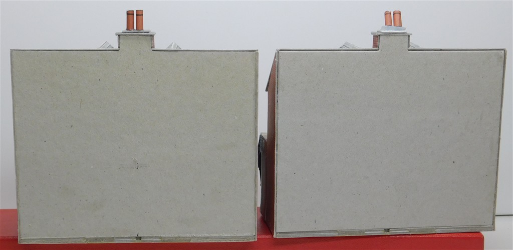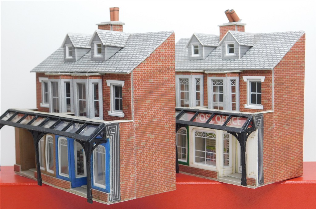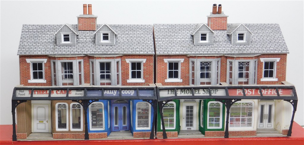 4 assembled Metcalfe low relief shops, reasonably well assembled but sadly the edges haven been finished, chimneys and arcade fronts need attention