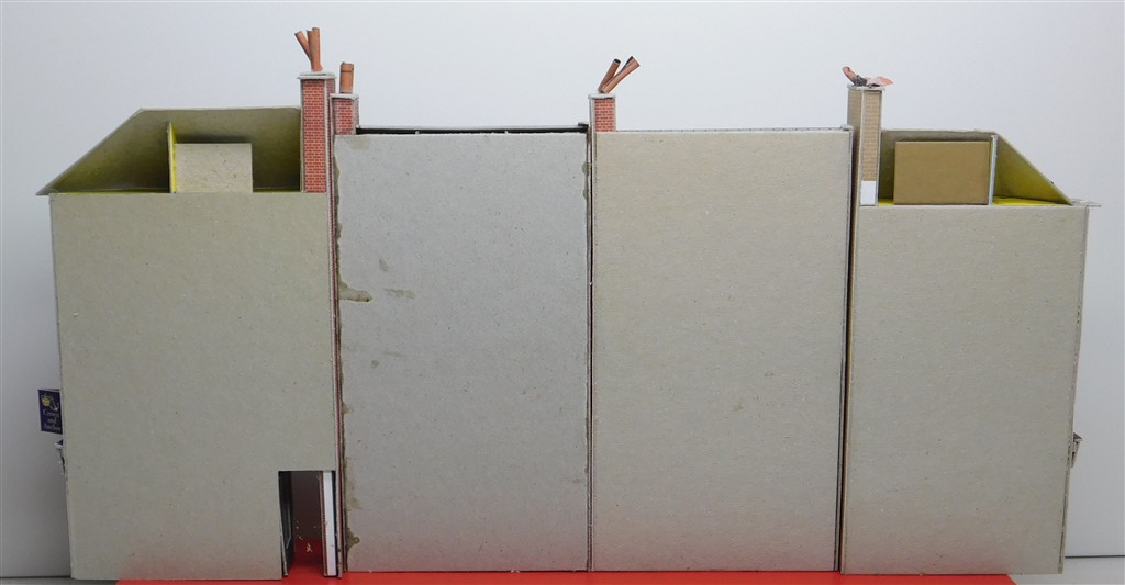 4 assembled Metcalfe low relief 3 storey shops, reasonably well assembled but sadly the edges haven been finished, chimneys need attention
