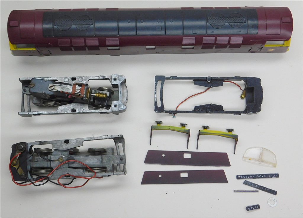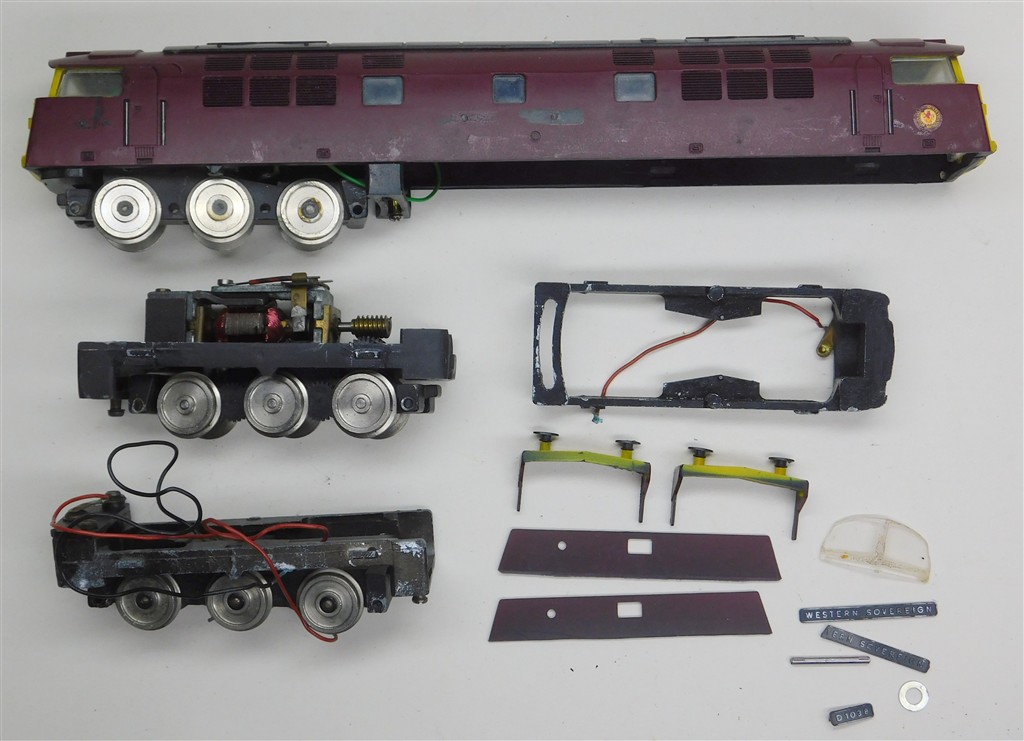 A Trix Western, missing some name and numberplates, in fair condition, motor is very reluctant when power applied, with a spare bogie, no wiring, please note this are 3.8mm/ft scale not 4mm/ft scale, no original box.