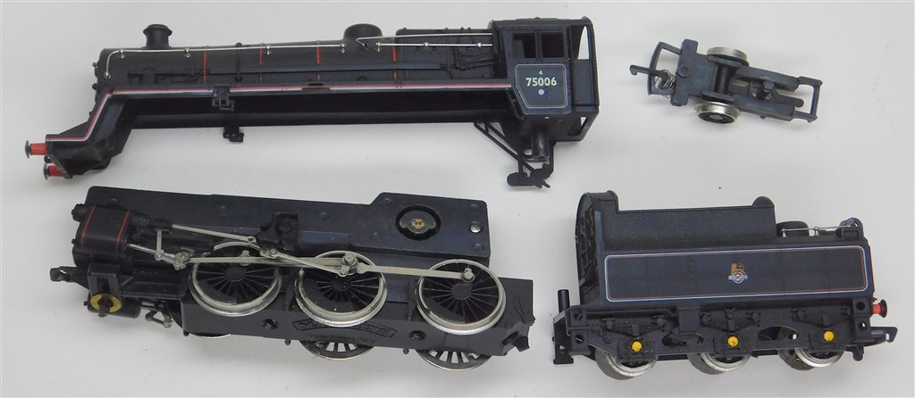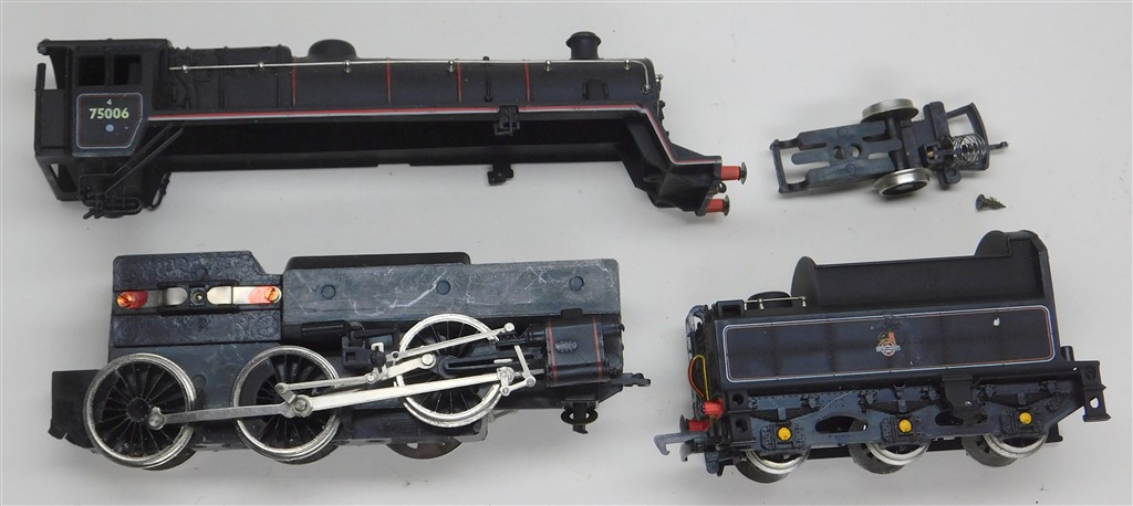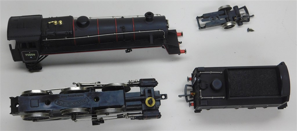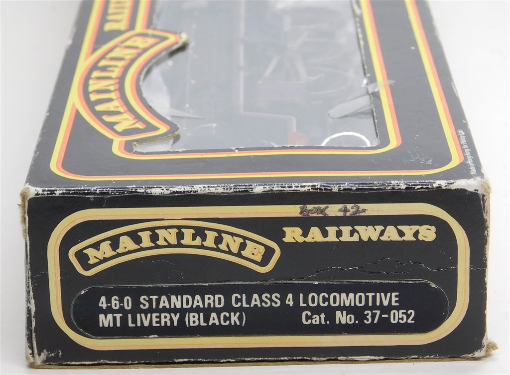 A Mainline Standard 4 for parts, motor runs but the wheels are loose, missing pony wheel and underframe screws, pony mount damaged, body and tender in good cosmetic condition, supplied in the original box, sold as a project