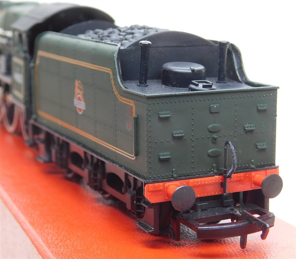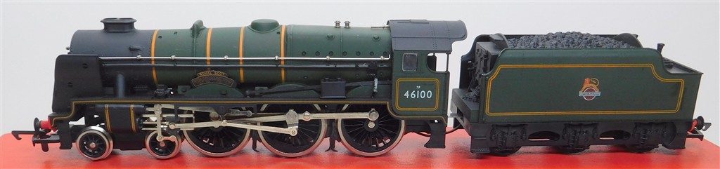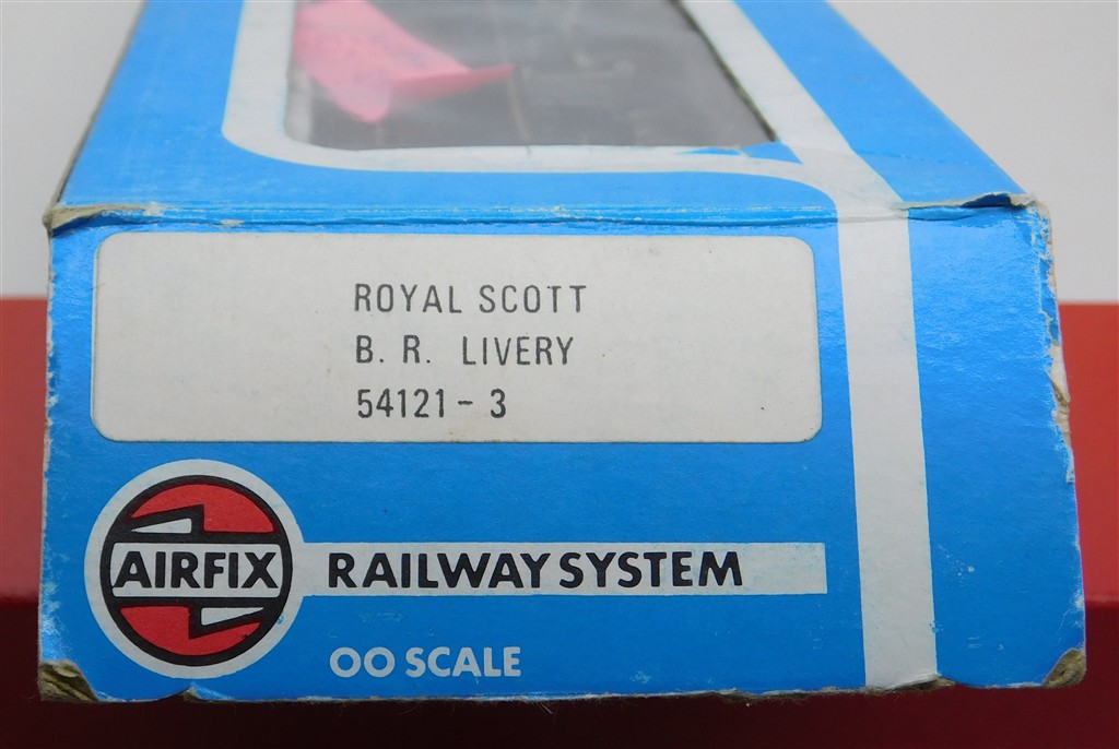An Airfix 54121-3 Royal Scot number 46100, noisy runner, would benefit from careful lubrication, added front footsteps will need removal for use on 3rd radius curves or tigher, supplied in a tatty original box, sold as a project