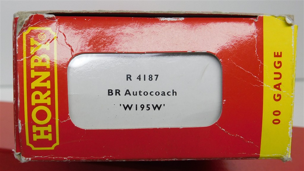 A Hornby R4187 BR ex GWR Autocoach coach W195W, changd buffers one end and missing one coupling hook otherwise in good condition, supplied in the original box