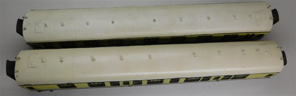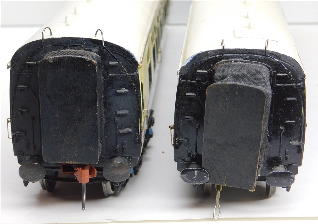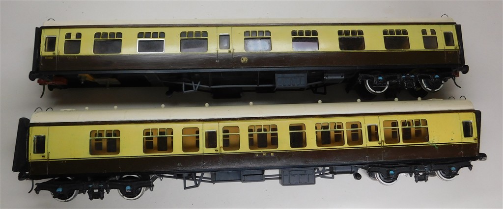 An interesting pair of homemade 0 gauge GWR coaches adapted from Lima coaches, missing one bogie, an interesting restoration project