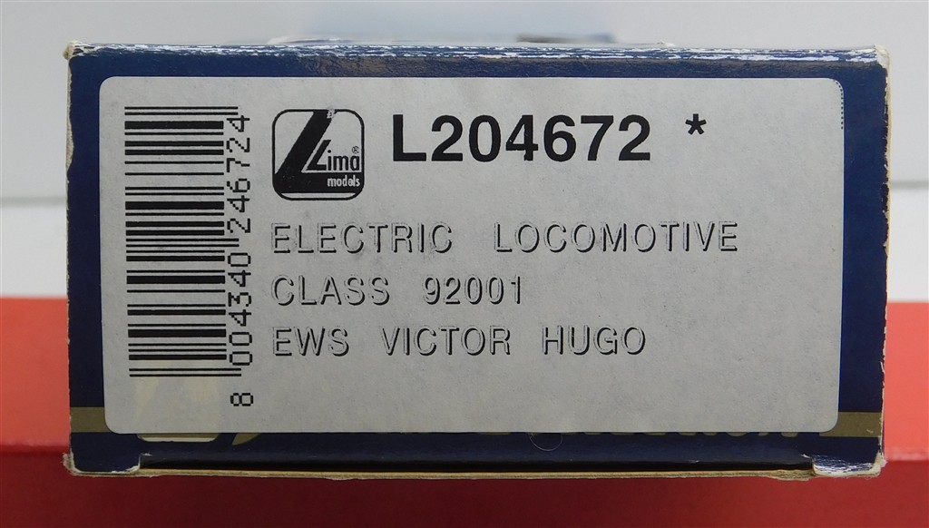 A Lima L204870 EWS Class 92 Overhead Electric Locomotive - 92001 Victor Hugo, good runner, in very good condition, supplied in the original box with detail sprues