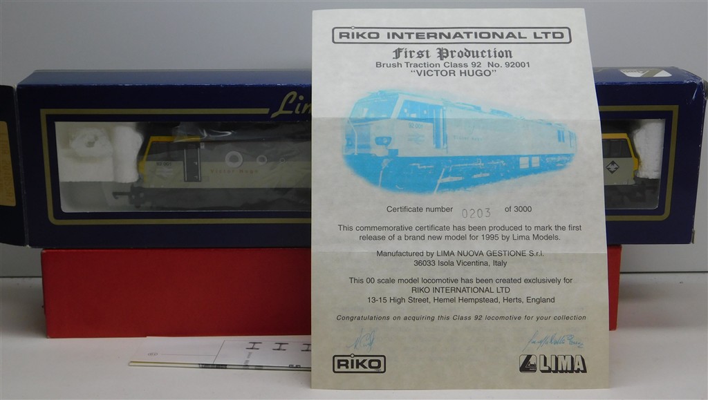 A Lima L204855 BR Railfreight Class 92 Overhead Electric Locomotive - 92001 Victor Hugo, good runner, one pantograph doesn't latch down, in very good condition, supplied in the original box with detail sprues and certificates