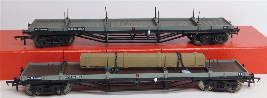 2 Bachmann BR bolster wagons B940334 and B943409, one with added load, in good used condition, no original boxes