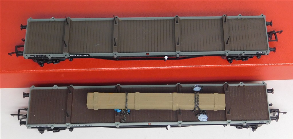 00 Wagons: 2 Bachmann BR bolster wagons B940334 and B943409, one with added load