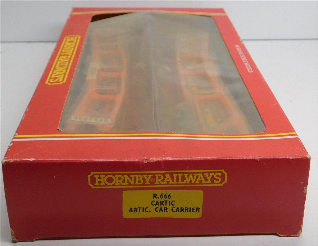 A Hornby R666 Silcock articulated car transporter with 15 cars, looks a little pale otherwise in good condition, supplied in a discoloured original box