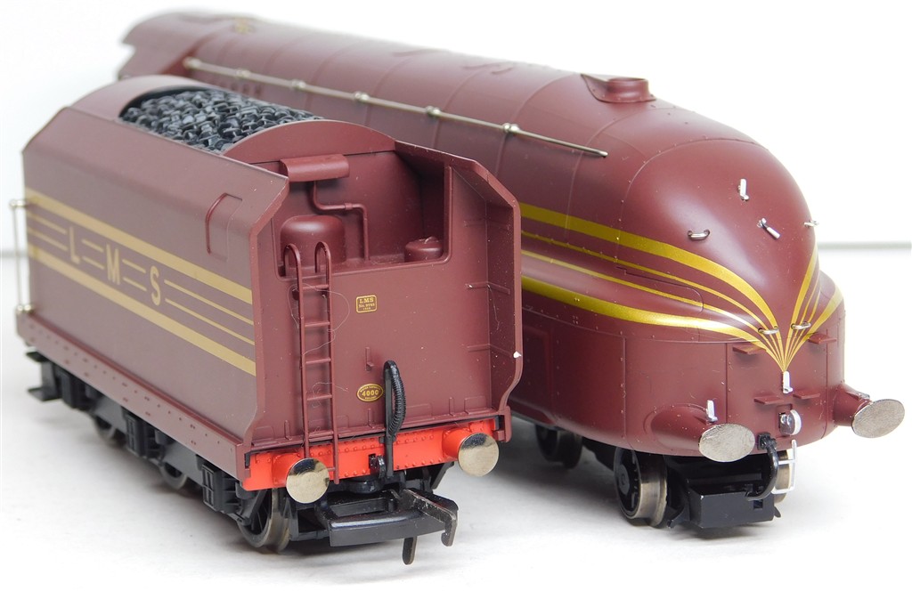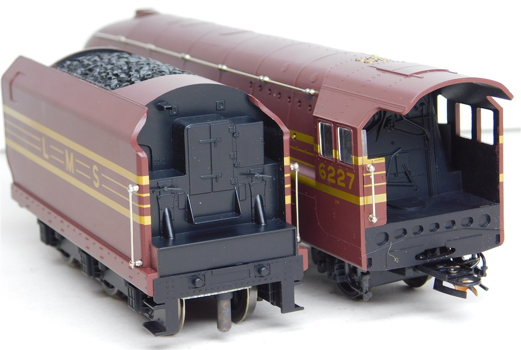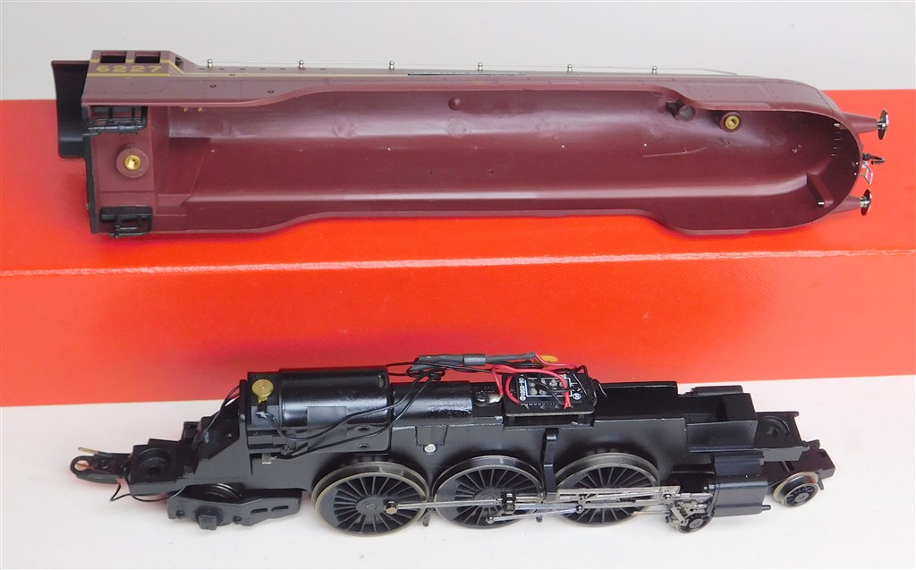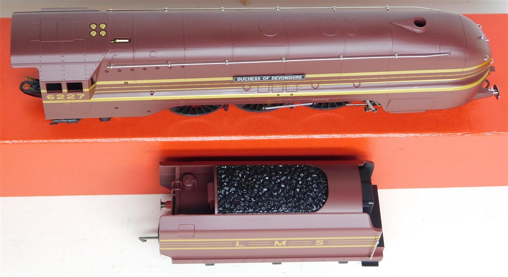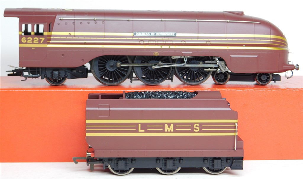 A Hornby loco drive streamlined LMS 6227 Duchess of Devonshire, red, motor runs but sometimes loses drive, occasionally makes a horrid clicking noise, cause of both issues needs investigating and fixing, new gear fitted but this hasn;t solved the drive issue, in very good cosmetic condition, no original box, sold as a project