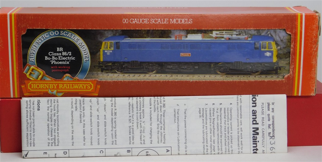 A Hornby 1980s production R360 BR Class 86 numnber 86 219 Pheonix, tested and a good runner, in very good condition, supplied in the tatty original box with paperwork.