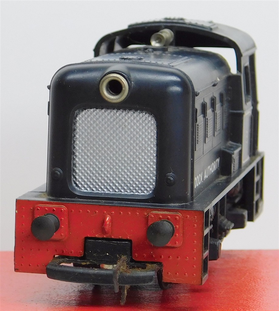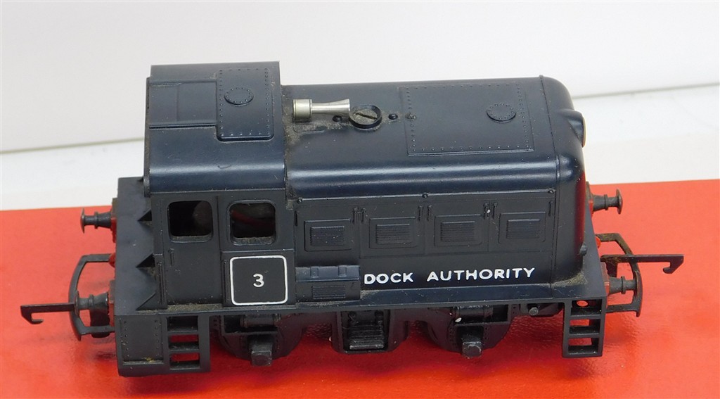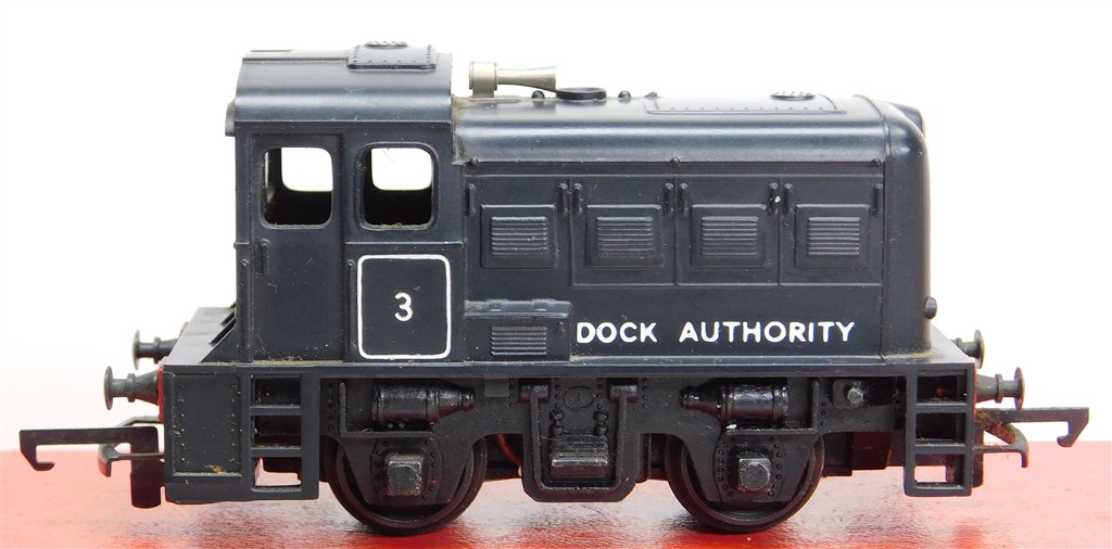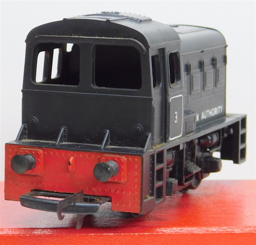 A mid 1970s production Hornby R253 black diesel dock shunter number 3, good runner with working non-directional headlight, in good condition, supplied in the tatty original box. Please note this loco needs a controller capable of delivering at least 600mA to run well, and doesn't like new Hornby or Peco points due to thick flanged wheels.