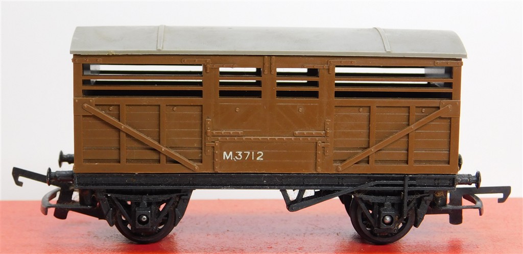A Tri-ang dung brown cattle wagon M3712, unusual colour, Mark III couplings and metal chassis with deep flanged wheels, open axle boxes, loose body, in good condition but needs a clean, no original box.