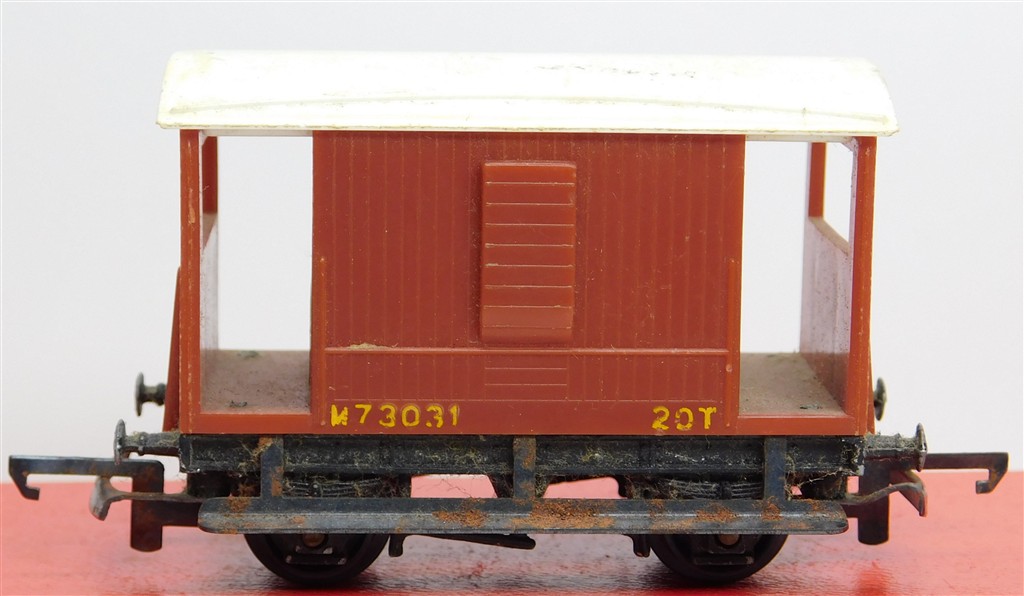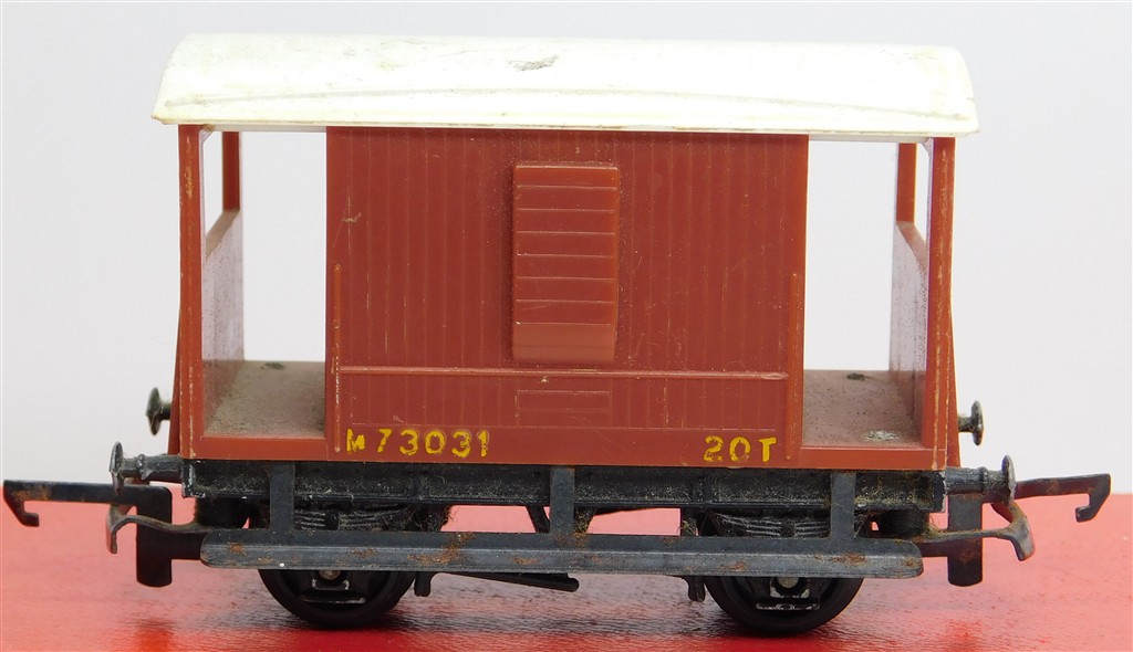 A Tri-ang brake van, produced in the Tri-ang Australian factory, in fair condition, rusty footsteps and couplings, yellow lettering M73031, open axle boxes with deep flanged wheels, no original box.