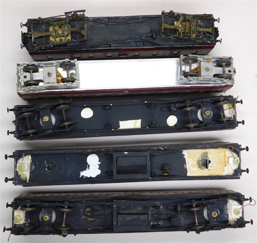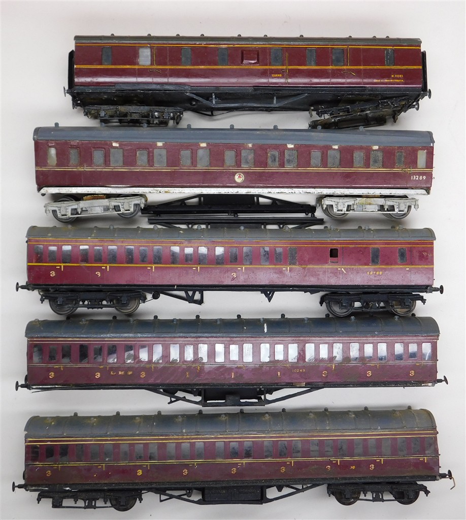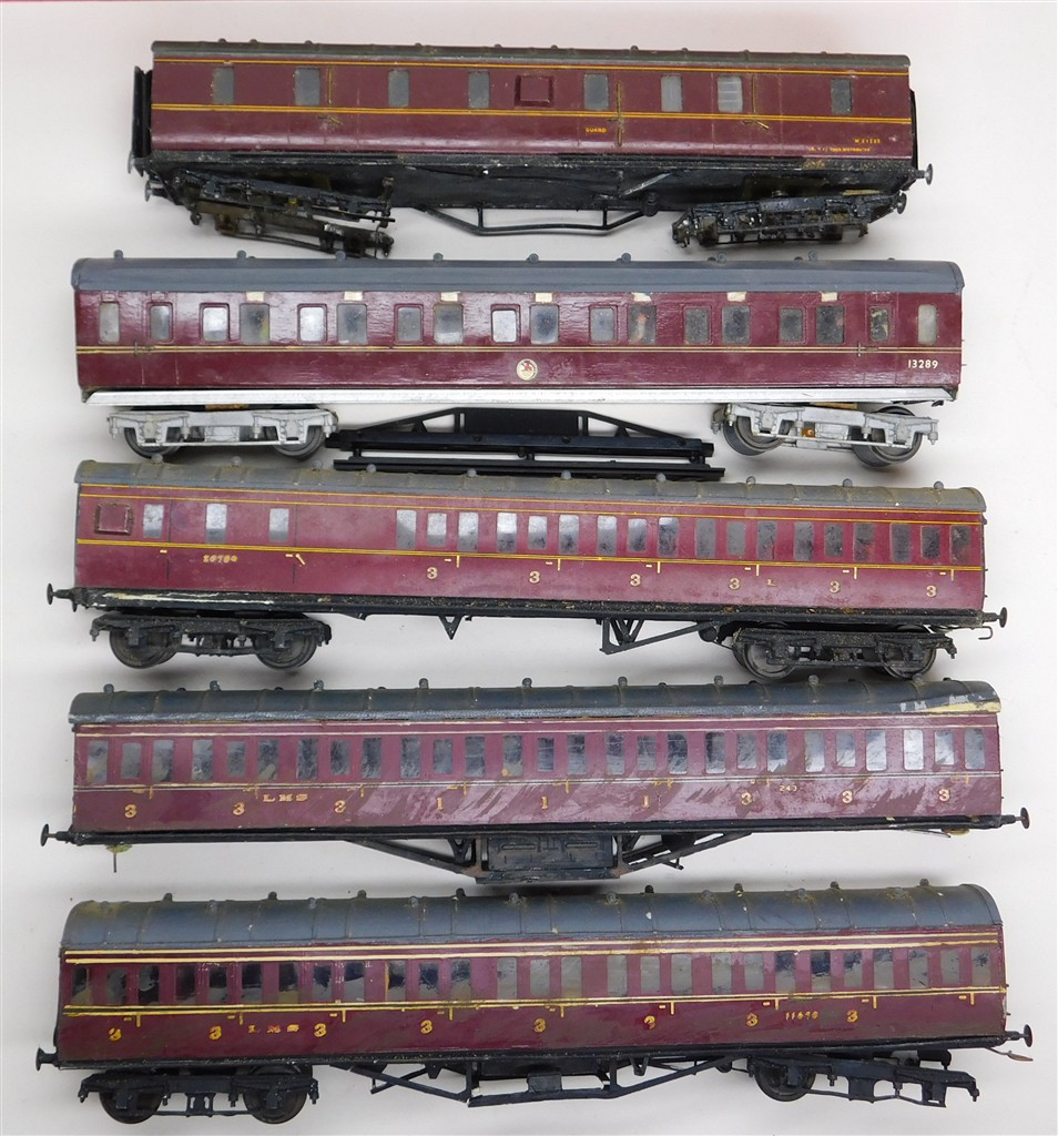 5 assorted incomplete kitbuilt LMS/BR coaches, all need attention, in poor condition, many small parts missing, some without wheels or bogies, no original packaging, a restoration project