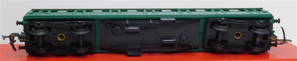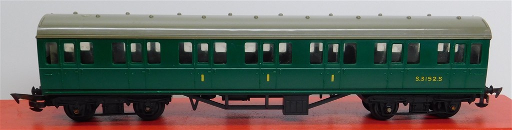 A Tri-ang BR(S) Green Composite Coach number S3152S, fitted with plastic bogies with deep flanged wheels and rusty MkII couplings otherwise in good condition, no original box