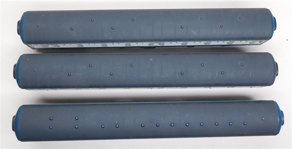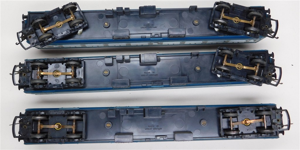 3 Hornby 1970s production blue and grey Mk2 coaches, 2 with primitive working lights, one with non-working primitive lights, in good used condition, bogie mounted couplings, no original boxes