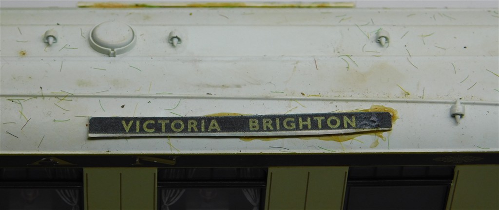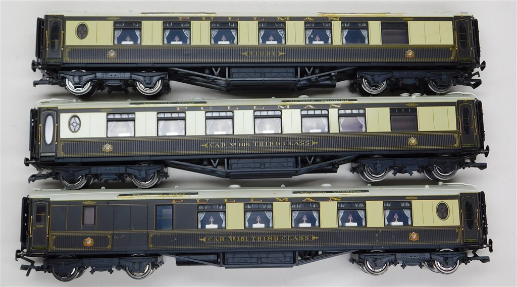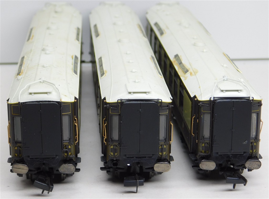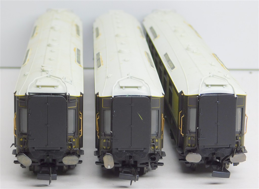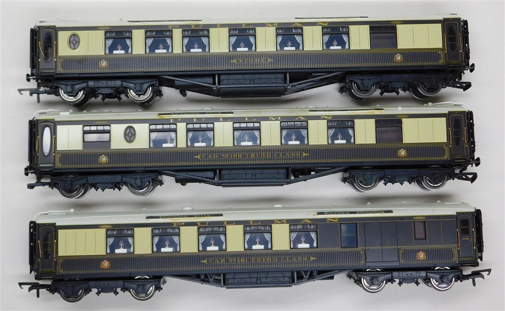 3 Hornby matchboard side Pullman cars with working lights, pickups need an electrical clean, Niobe and cars number 166 and 161, roofs need cleaning and repainting, some small glue spots, 2 buffers missing, one bent coupling, in fair condition, close coupling mechanisms but no NEM pockets, no original boxes
