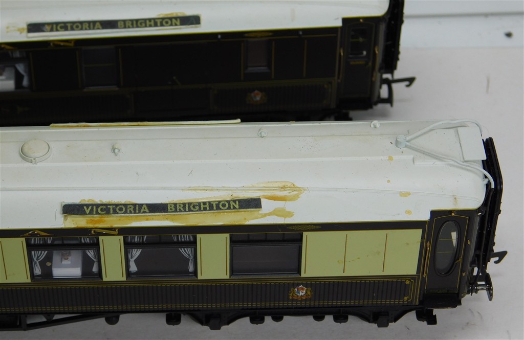 00 Coaches: 3 Hornby matchboard side Pullman cars with working lights, roofs need cleaning and repainting