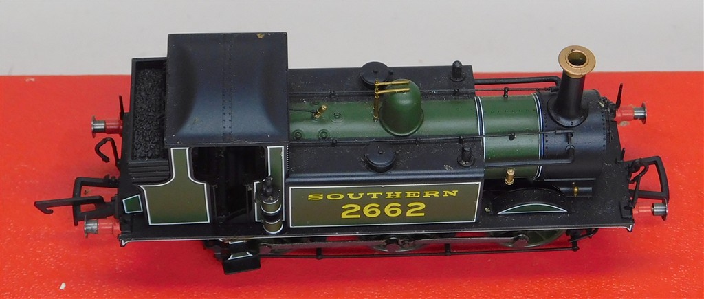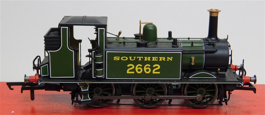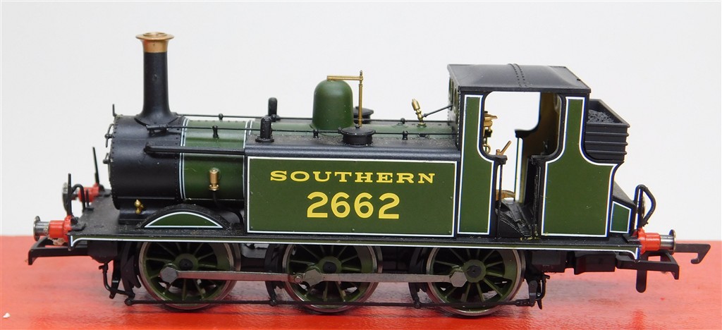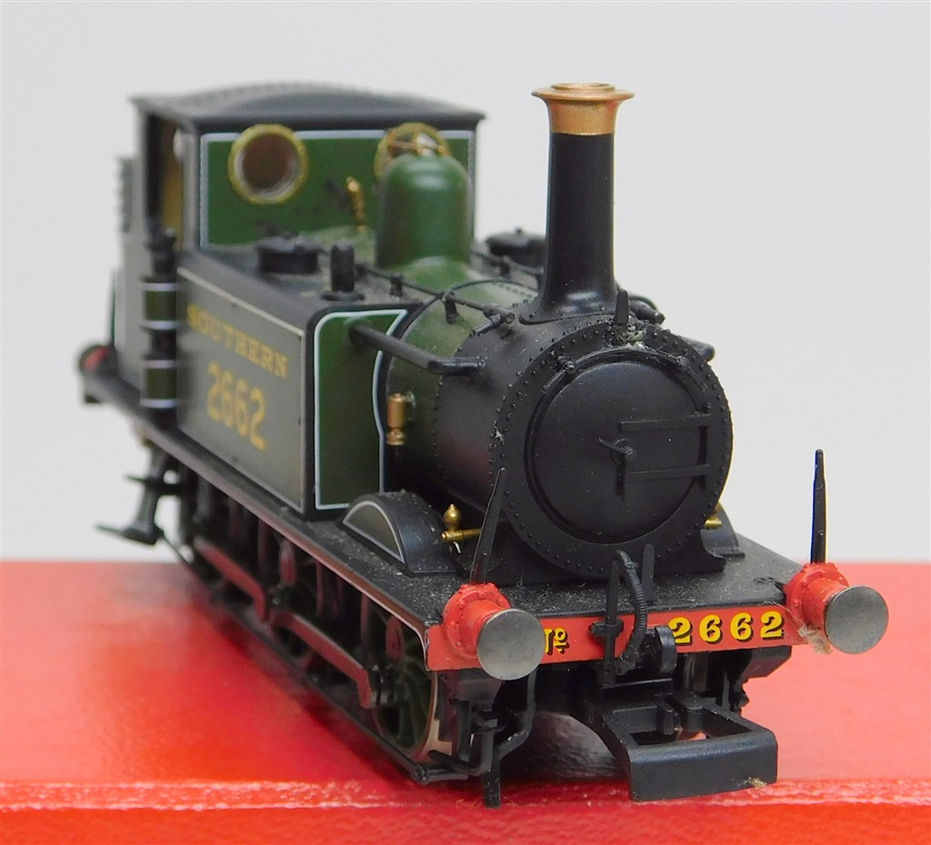 A Hornby R3783 Southern Terrier 2662, pickups need adjustment as they don't make proper contact with the wheels so it is a reluctant runner, needs an electrical clean too, apart from a glue spot on the front in good condition, supplied in the original box, sold as a project