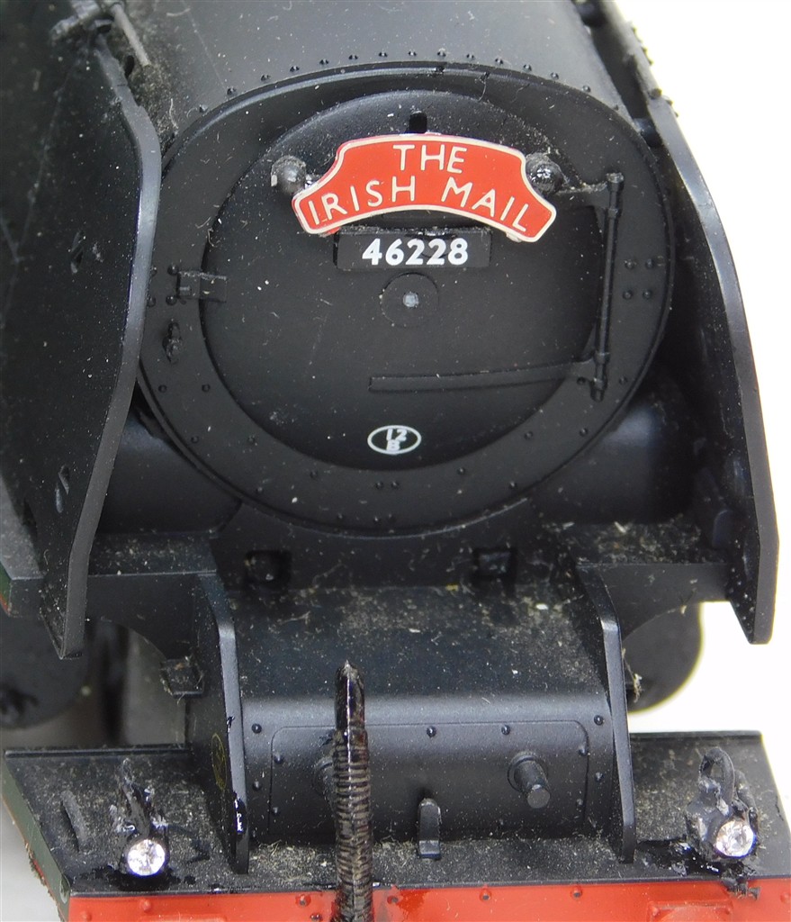 A Hornby loco drive BR Duchess of Rutland steam loco number 46228 with added front end details and Irish Mail train headboard, good runner, in good condition, needs a good clean, supplied in the original box.