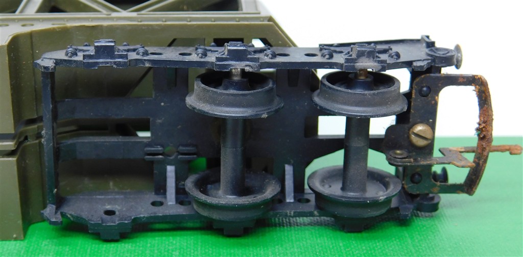 A Tri-ang Battlespace glider launching car, khaki, unnumbered, no glider, missing one wheelset, in fair condition but would benefit from a further clean, no original box