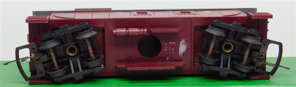 A Tri-ang TC TR shield caboose TR 7482, plastic bogies, missing chimney, slightly rusty couplings and axles, in good condition but would benefit from a further clean, no original box