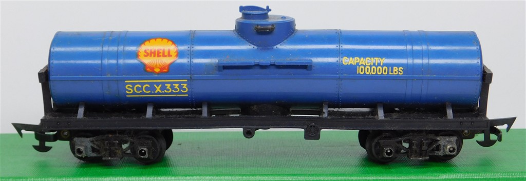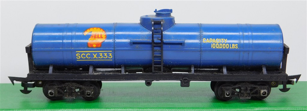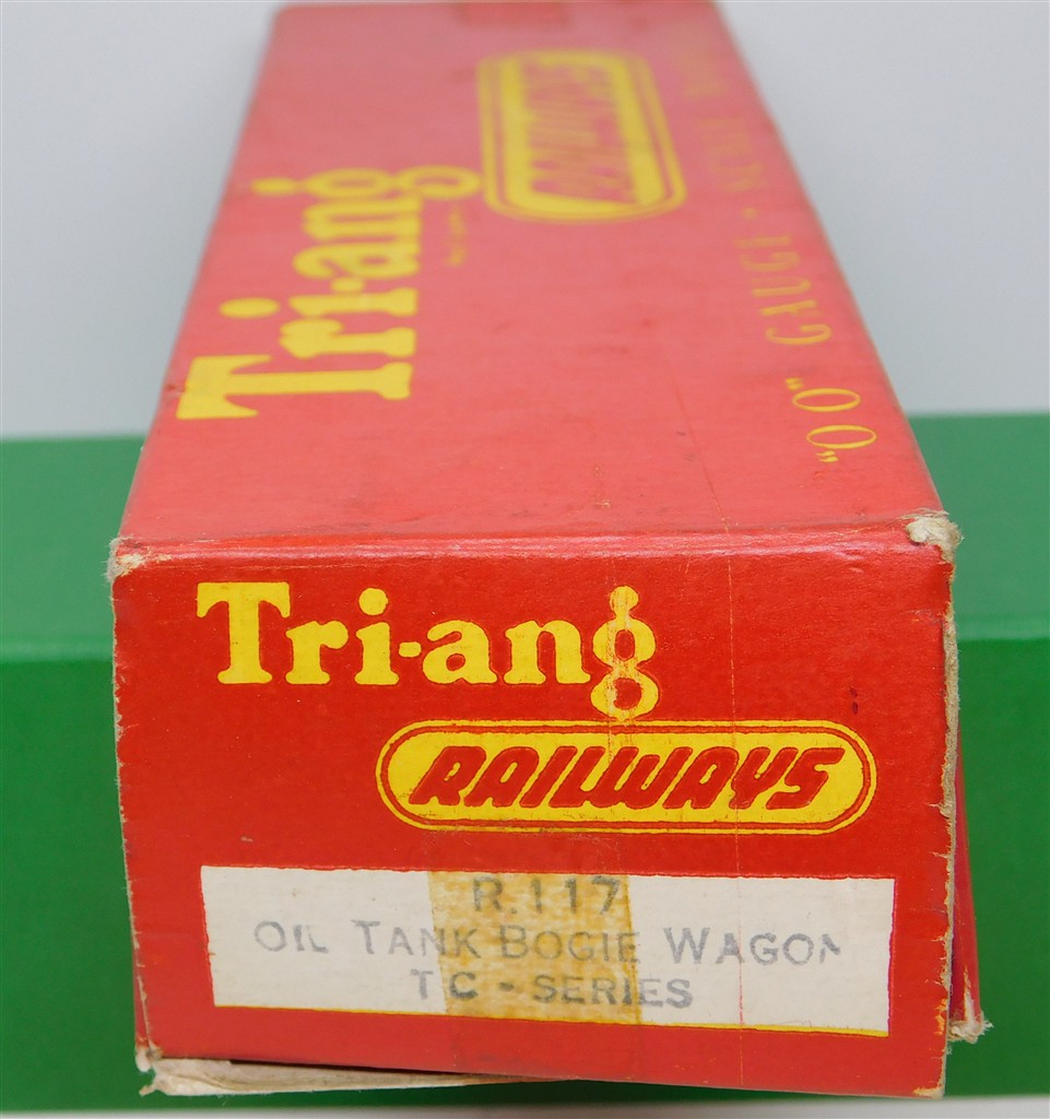 A Tri-ang R117 TC bogie tank car, blue, metal bogies with deep flanged wheels and MkII couplings, in fair condition but would benefit from a further clean, supplied in the original box