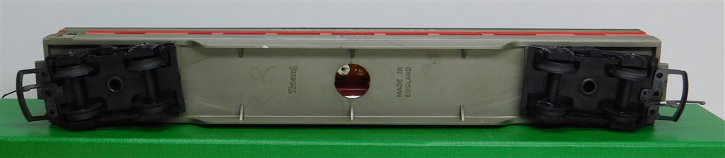 A Tri-ang TC TR 1st series silver and red observation car 20425 with plastic bogies with deep flanged wheels, slightly bowed roof, rust spots on the couplings otherwise in fair condition but would benefit from a further clean, no original box