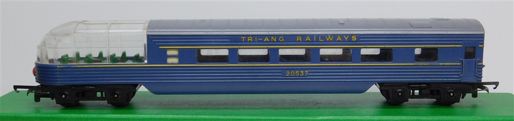 A Tri-ang TC TR 1st series blue beavertail observation car 20537 with plastic bogies with deep flanged wheels, grey roof, rust spots on the couplings otherwise in fair condition but would benefit from a further clean, no original box