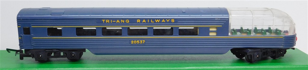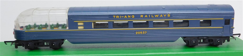 A Tri-ang TC TR 1st series blue beavertail observation car 20537 with plastic bogies with deep flanged wheels, blue roof, rust spots on the couplings otherwise in fair condition but would benefit from a further clean, no original box