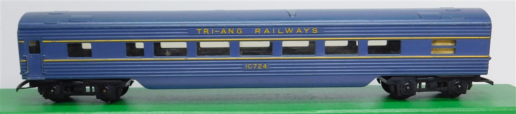 A Tri-ang TC TR 1st series blue passenger car 10724 with plastic bogies with deep flanged wheels, blue roof, missing coupling hooks, rust spots on the couplings otherwise in fair condition but would benefit from a further clean, no original box