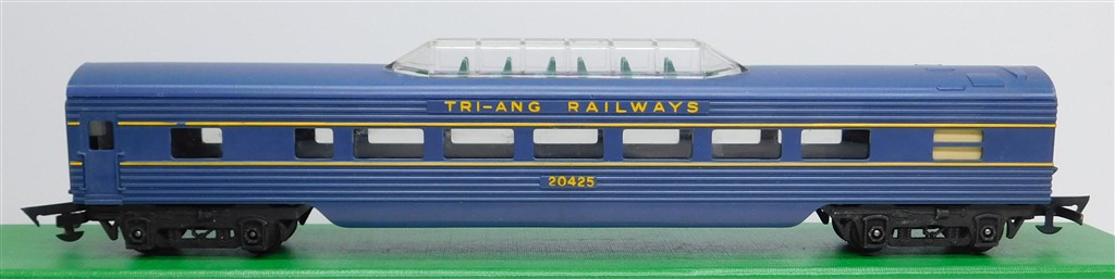 A Tri-ang TC TR 1st series blue observation car 20425 with metal bogies with deep flanged wheels and MkII couplings, blue roof, rust spots on the couplings otherwise in good condition but would benefit from a further clean, no original box