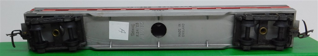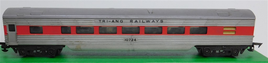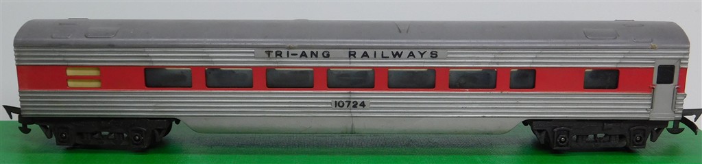 A Tri-ang TC TR 1st series silver and red passenger car 10724 with metal bogies with deep flanged wheels and MkII couplings, rust spots on the couplings otherwise in fair condition but would benefit from a further clean, no original box (A)