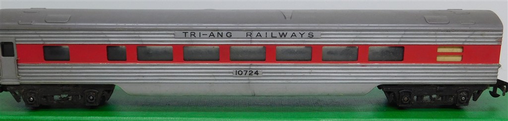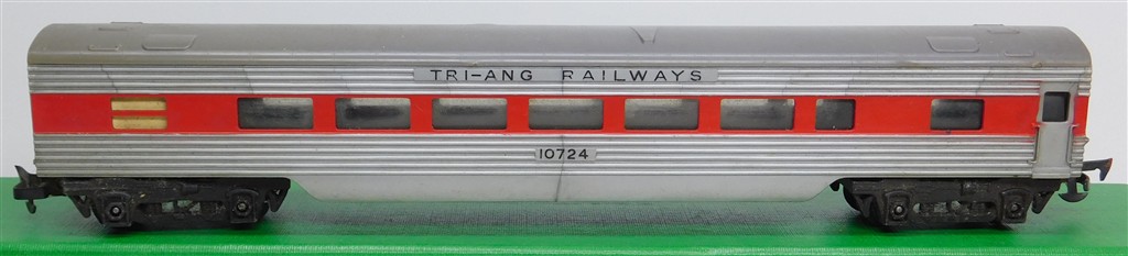 A Tri-ang TC TR 1st series silver and red passenger car 10724 with metal bogies with deep flanged wheels and MkII couplings, rust spots on the couplings otherwise in fair condition but would benefit from a further clean, no original box (B)