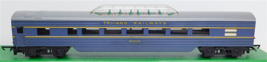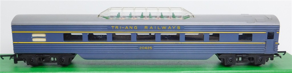 A Tri-ang TC TR 1st series blue observation car 20425 with plastic bogies with deep flanged wheels, grey roof, rust spots on the couplings otherwise in good condition but would benefit from a further clean, no original box