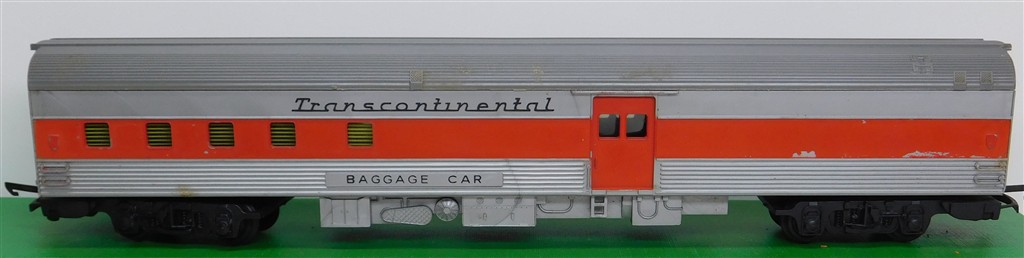 A Tri-ang TC Transcontinental 2nd series silver and red baggage car, considerable red paint loss, marks on the roof and rust spots on the couplings otherwise in fair condition but would benefit from a further clean, no original box