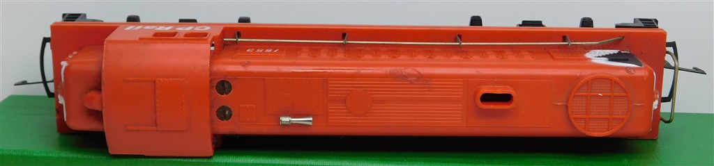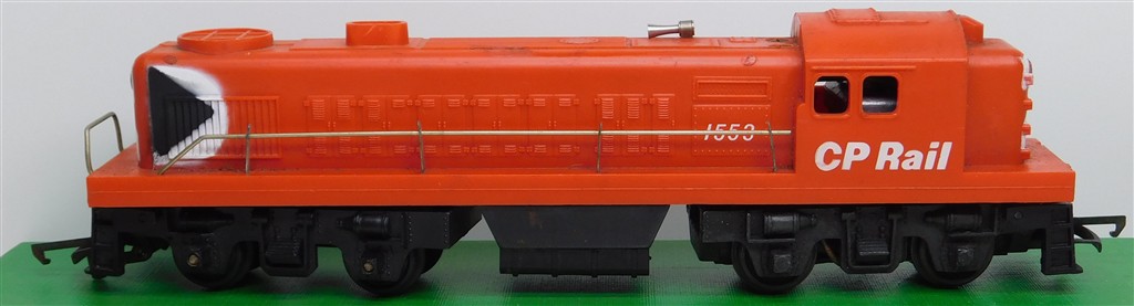 A Hornby Canadian CPRail red diesel switcher loco 1553, good if noisy runner, lights, re-wired, with both skirts and battery box, slightly rusty bent couplings, some minor heat distortion on the body, in fair condition but would benefit from a further clean, no original box. Please note this loco needs a controller capable of delivering at least 1A to run well, and doesn't like new Hornby or Peco points as it has deep thick flanged wheels.